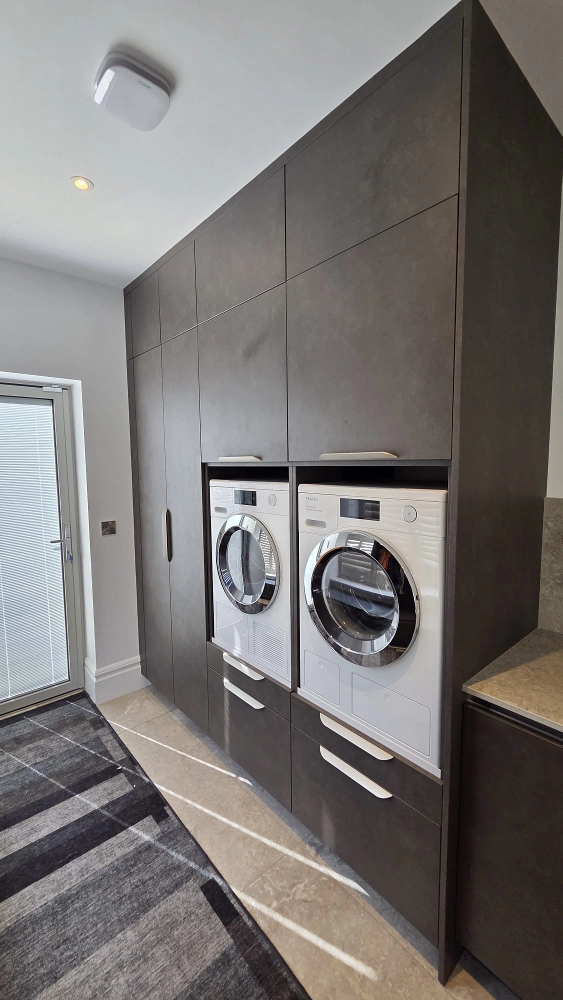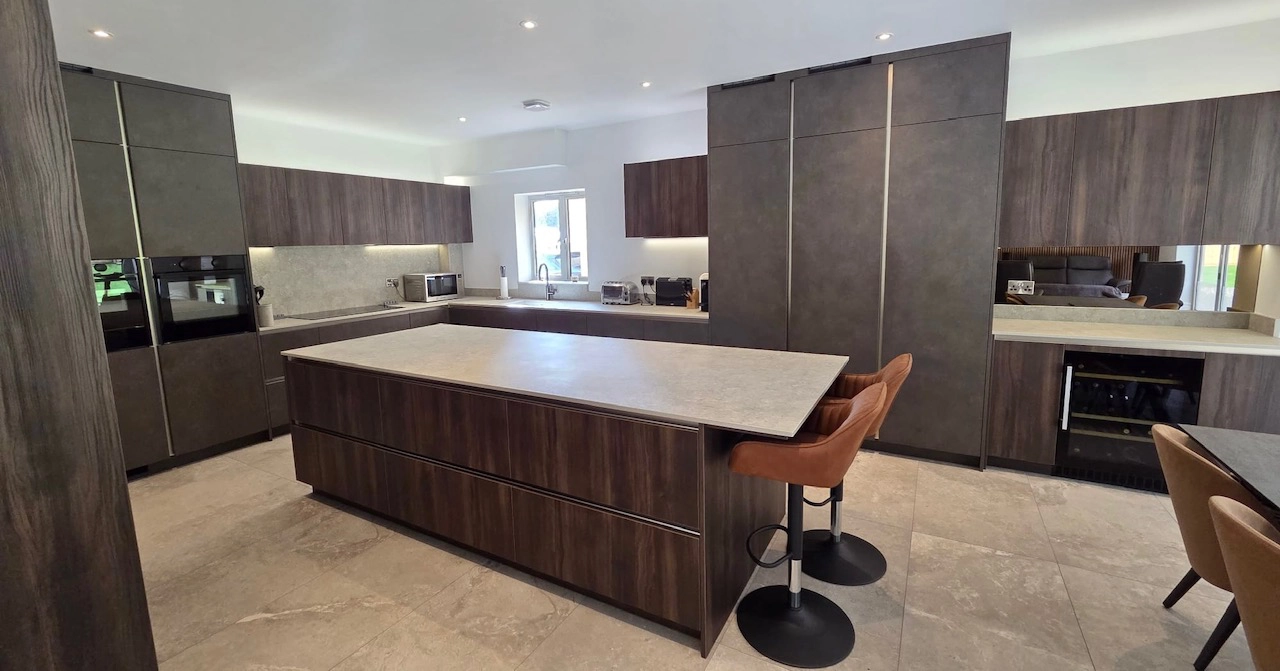 We utilised Beckermann’s world-renowned German engineering for the core of this build. The doors are finished in Stone Lava and Silvia Santiago Oak, providing a textured, matte appearance that is highly resistant to fingerprints. The oak finish extends to the bespoke internal furniture and shelving, ensuring the “luxury” feel is present every time a drawer is opened.